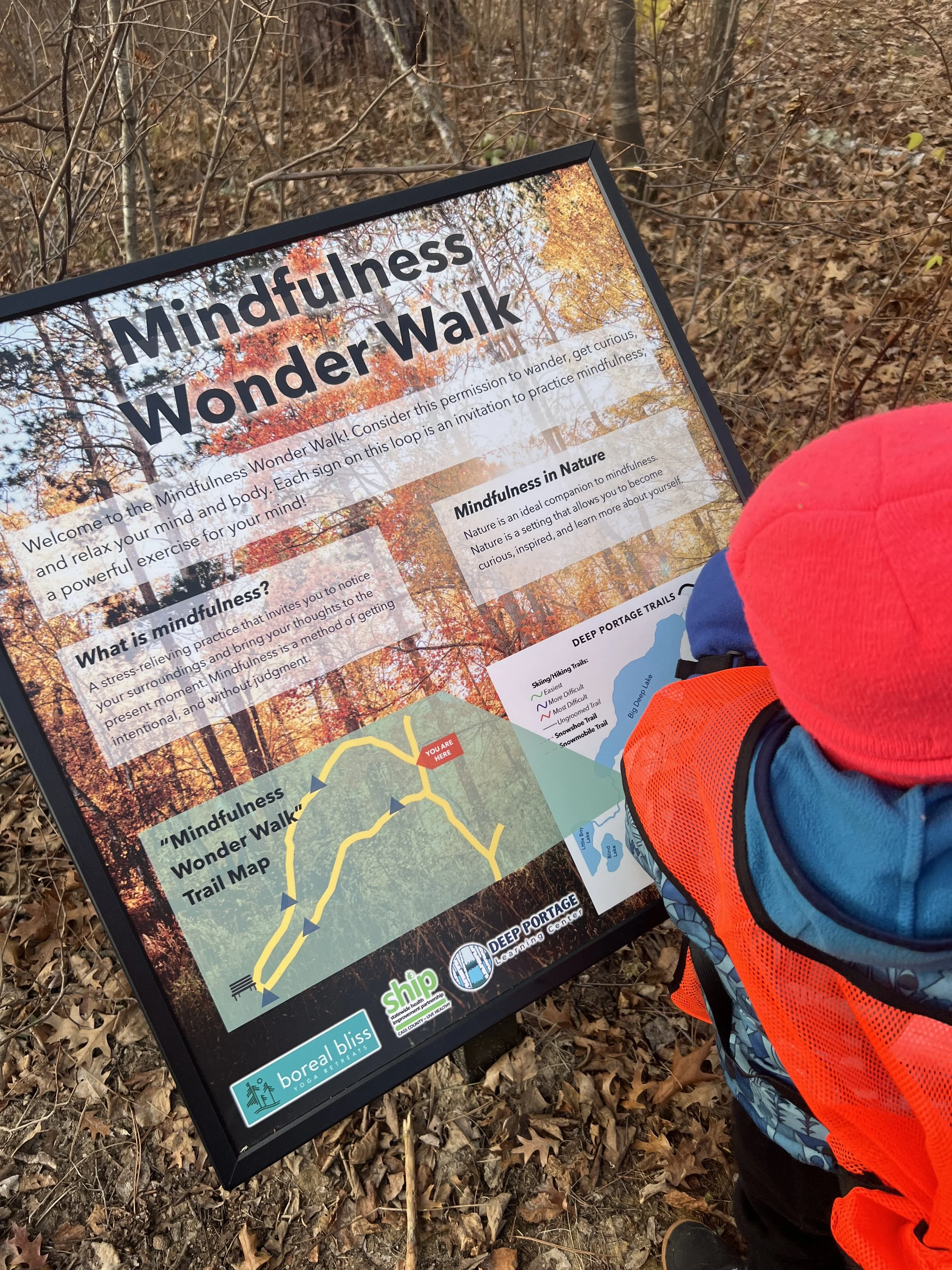 There’s a new permanent exhibit in the Northwoods now open to the public. It’s a mindfulness trail at Deep Portage Learning Center in Hackensack, MN. I cannot believe I get to share that we helped create it! It honestly feels surreal to write that. In the 6,307 acres of preserved forest at Deep Portage….we helped create a mindfulness trail.