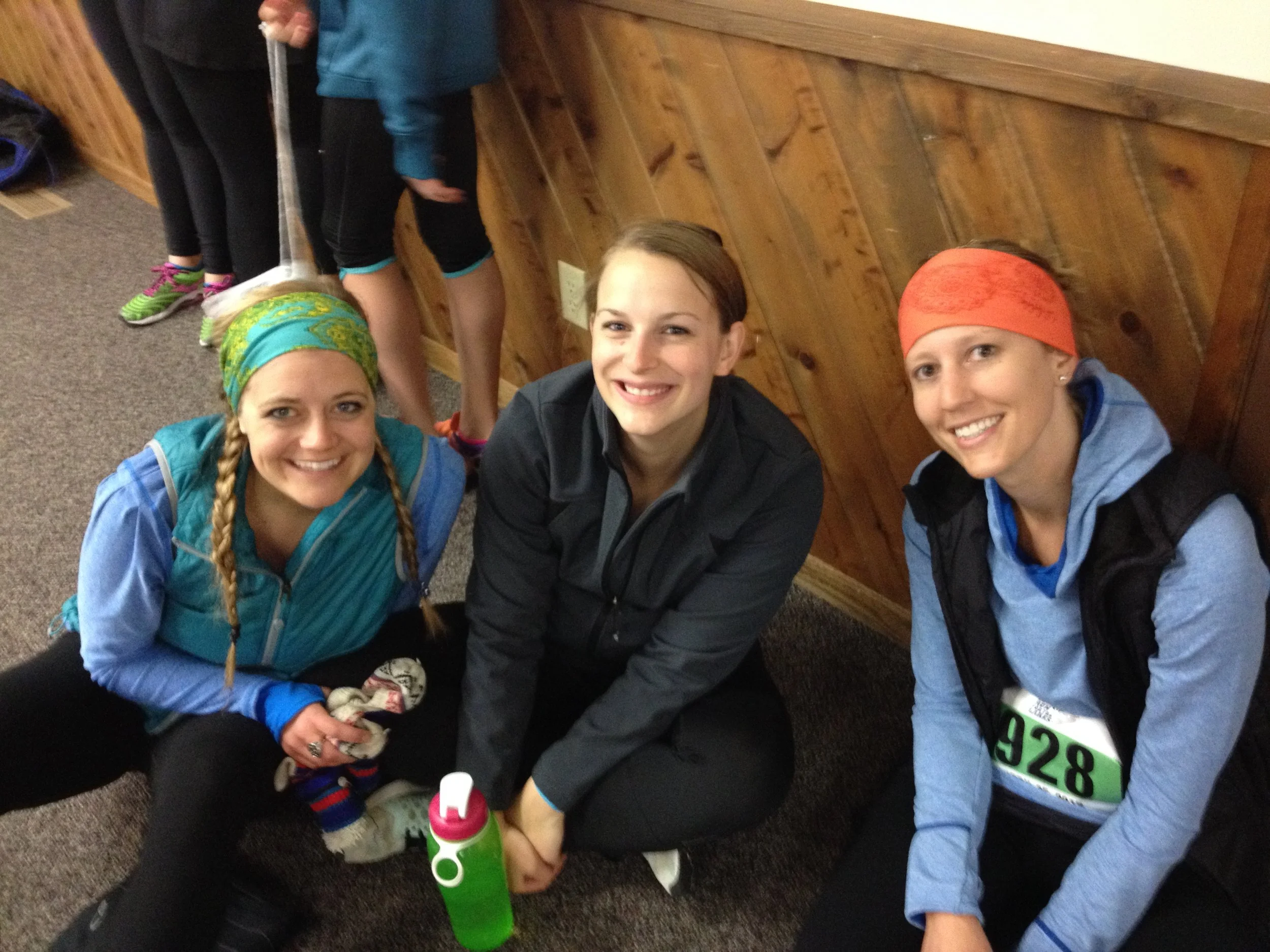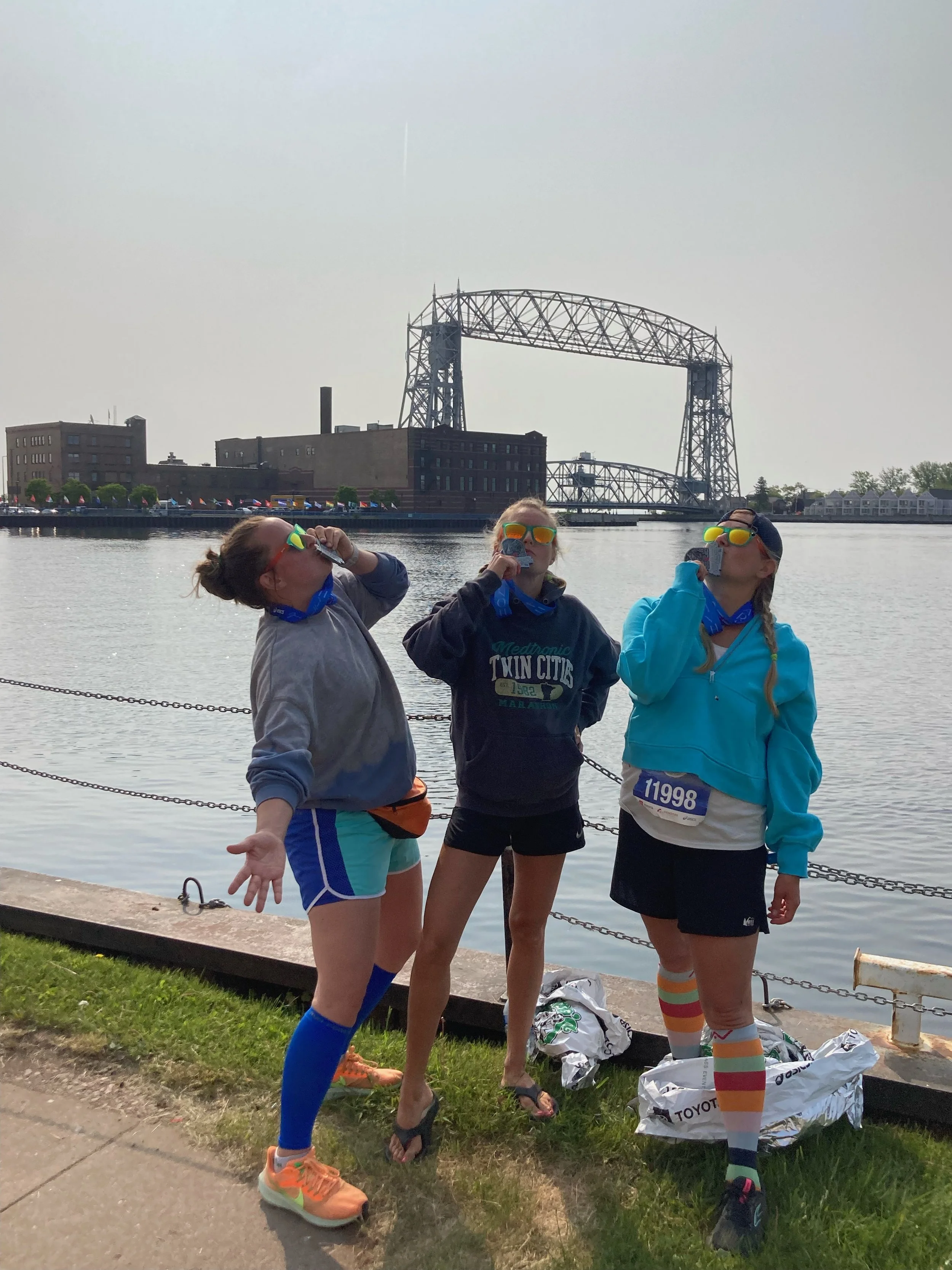 2023 post-Grandma’s Half! Bryana, Amanda’s cousin Michelle, and Amanda celebrating!