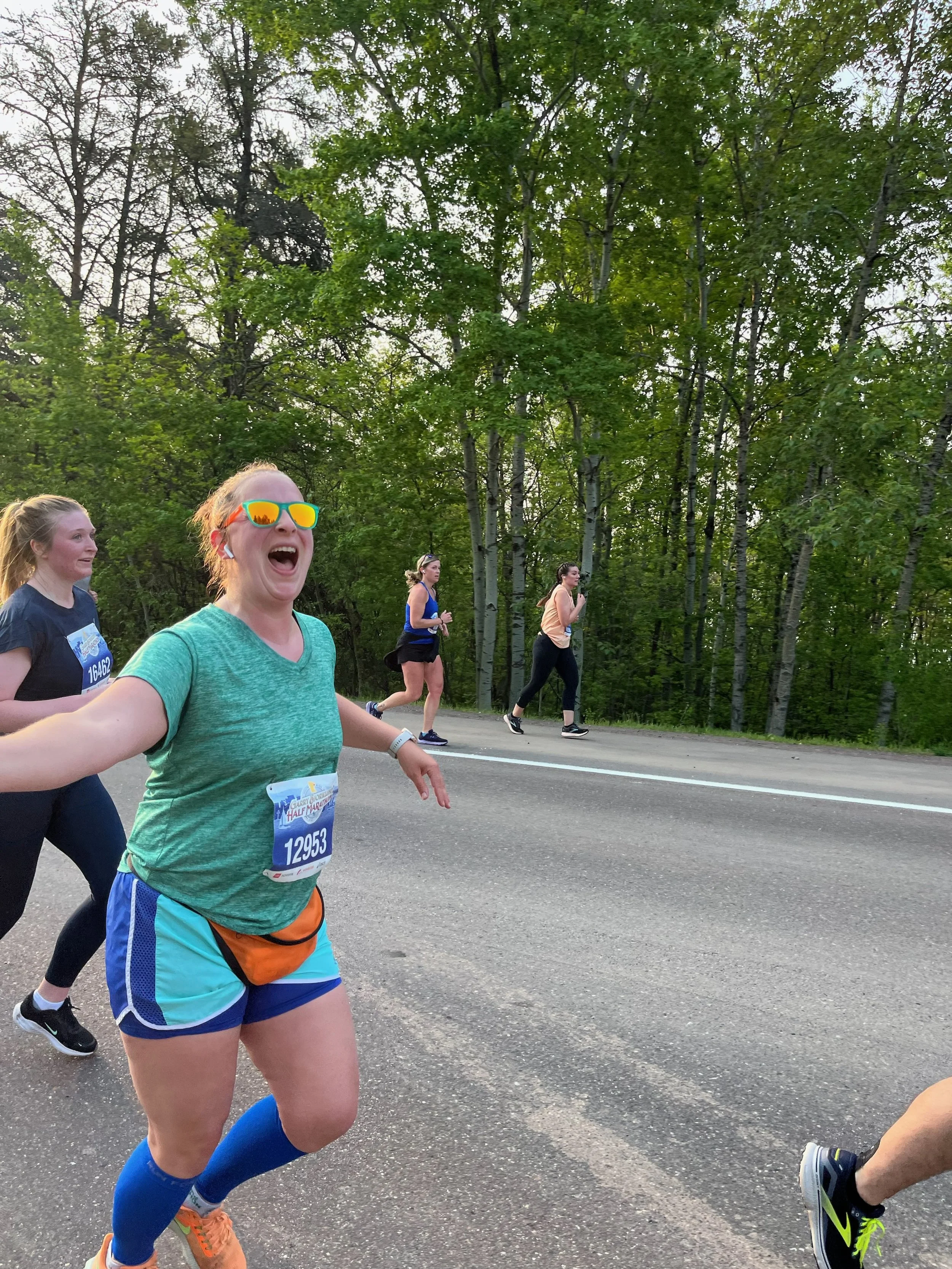 Running Grandma’s Half in 2023 and high-fiving my friend. I smiled so much during this race, my cheeks hurt at the end. It had been a couple years of injuries/babies since I raced!
