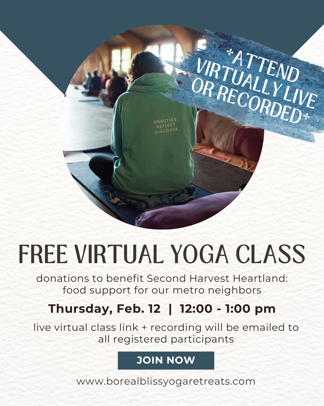 The yoga class is free, yet we encourage all participants to donate to Second Harvest Heartland through our provided donation link. You also do need to register for the free class in order to receive the class link + recording.