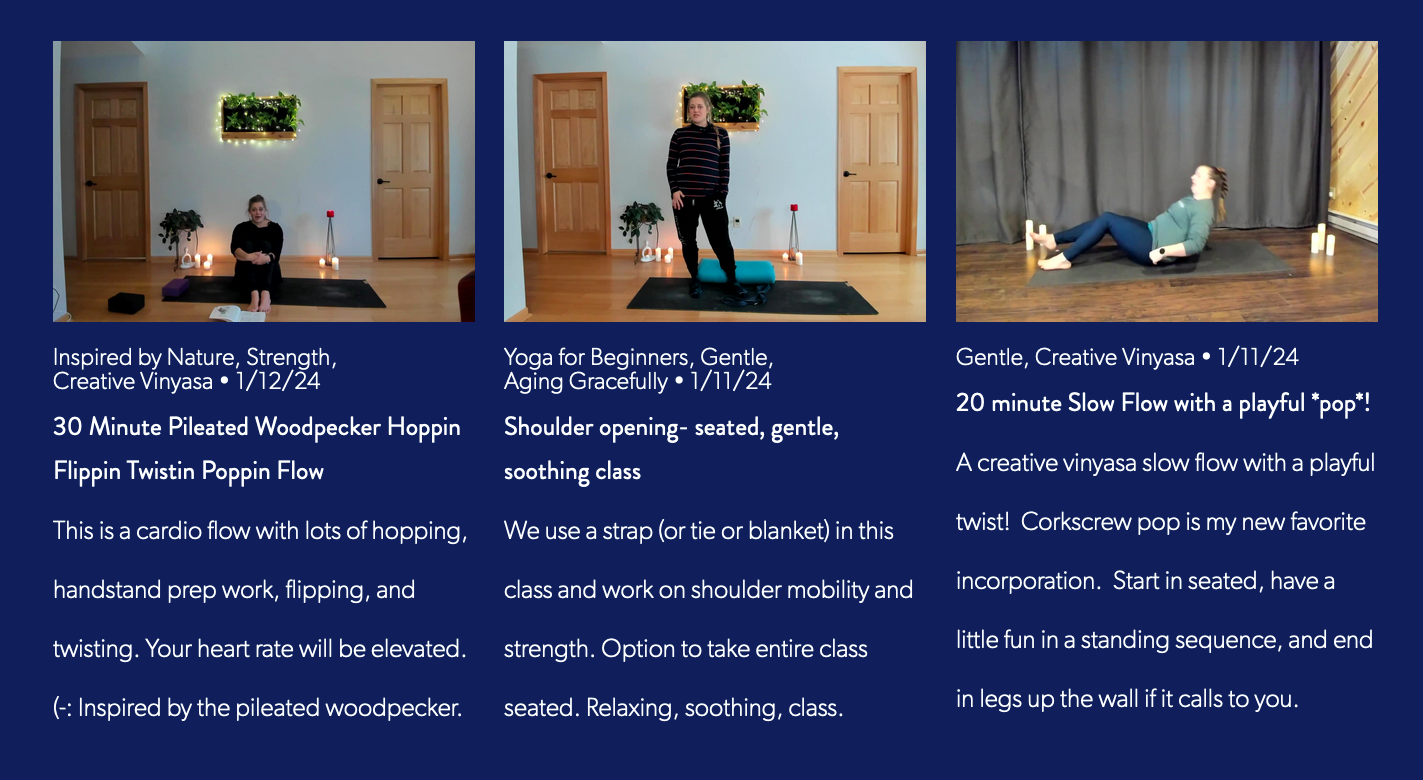 Has so much to offer! We have categories filmed in: gentle, beginner, prenatal, creative vinyasa, strength, aging gracefully, inspired by nature, and more!