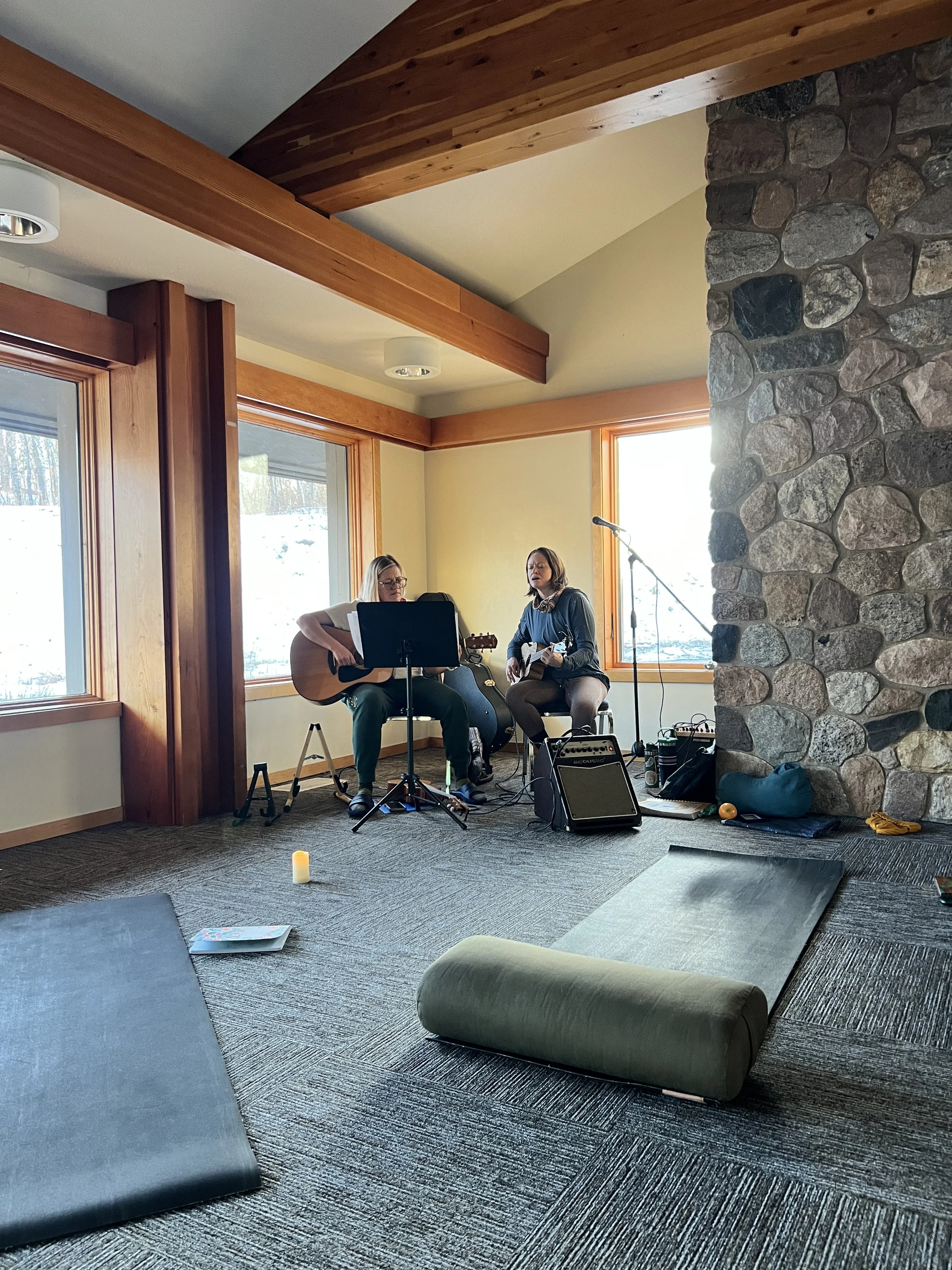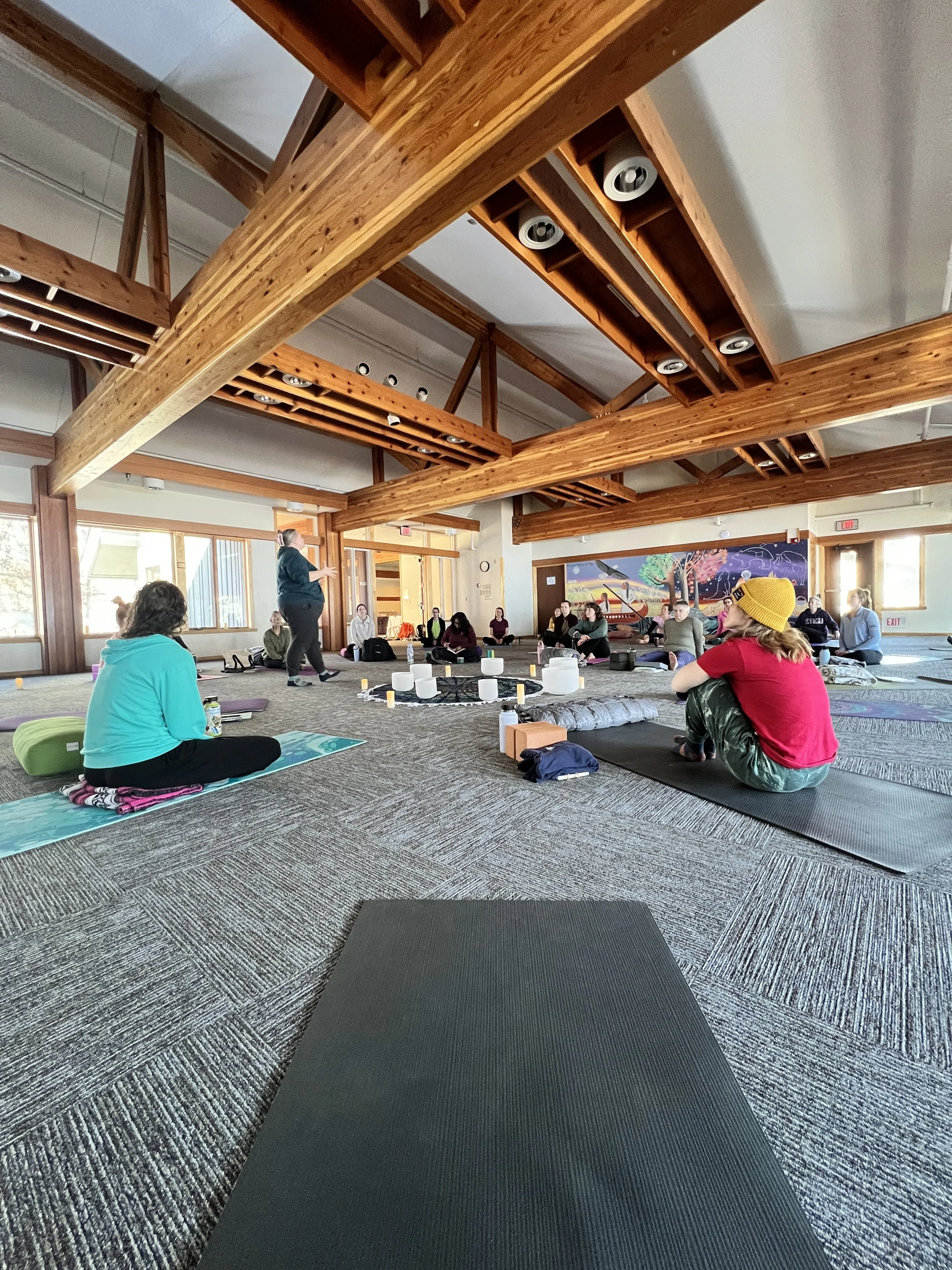 In the evening, we came together for a special Chakra Workshop. This Chakra Workshop came to be at a retreat at Wolf Ridge in 2017 or 2018. It was the first time we realized we could tap into our own talents to create something special, not just teach what we’d learned in our YTTs. We wanted to bring this workshop to our Jubilee retreat as part of our celebration of how far we’ve come. A mixture of reiki, poetry, sound bowls, and live music had us all feeling wildly aligned and relaxed before dinner.