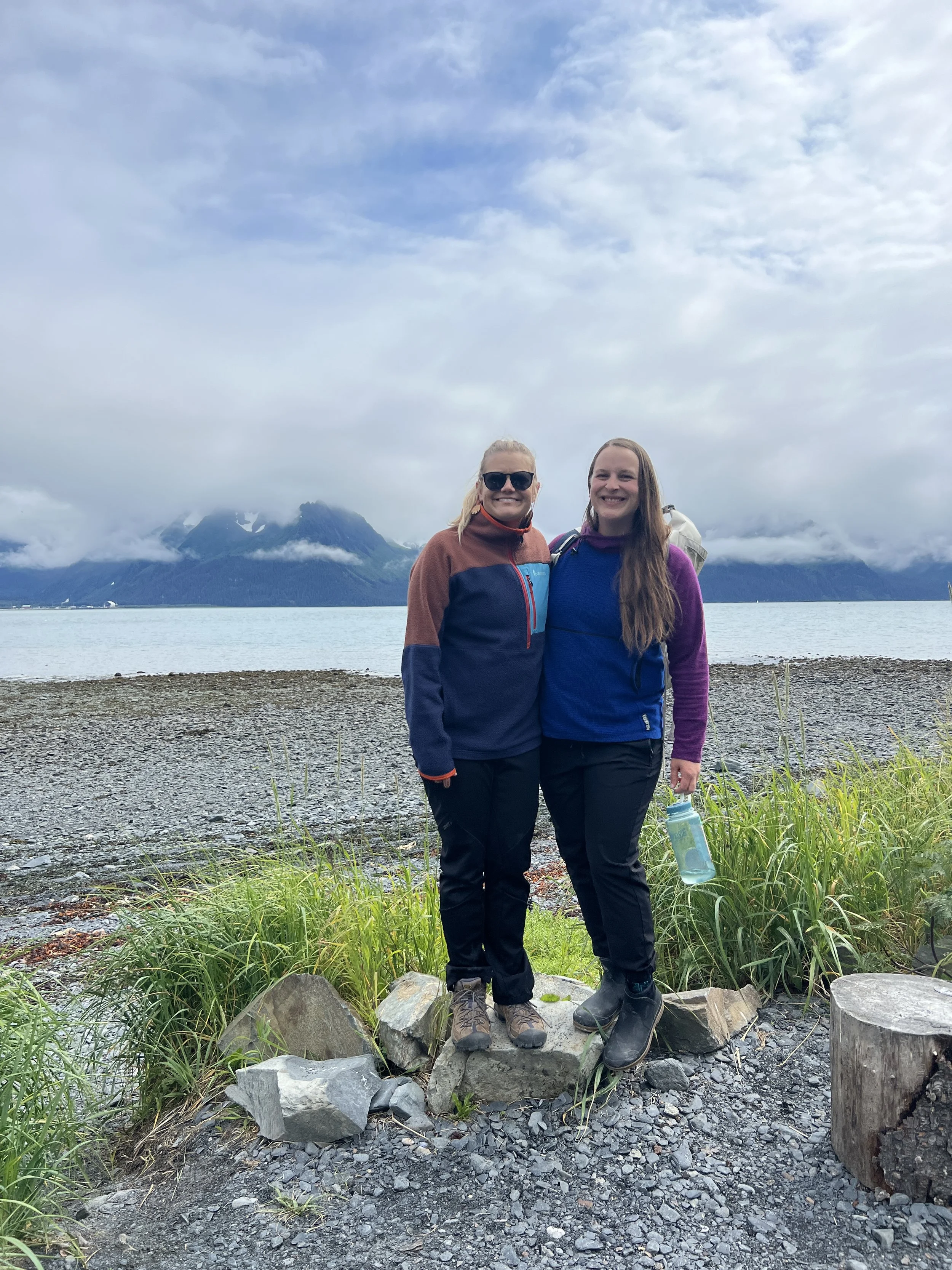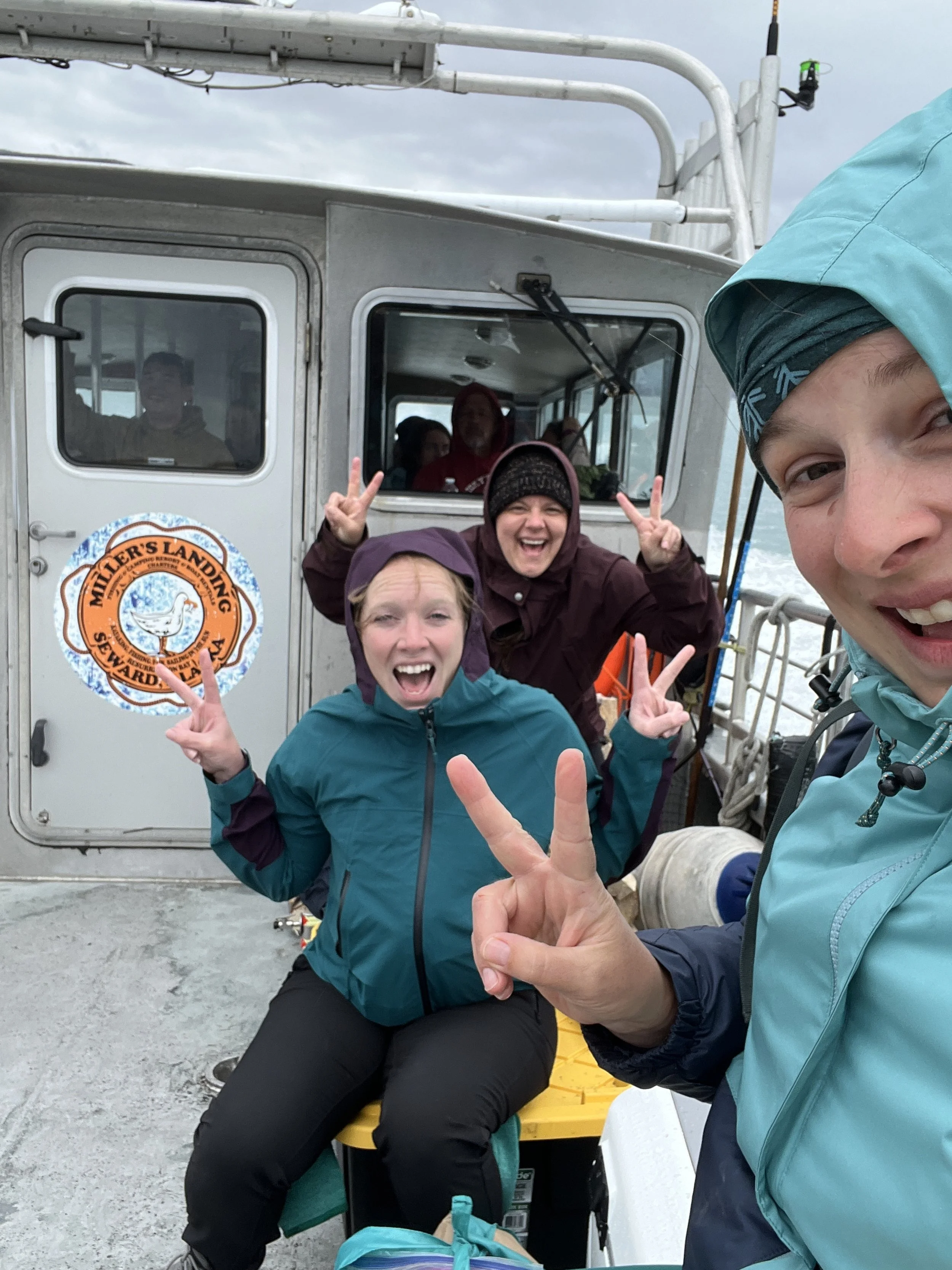 On our second full day in Seward, most of the group met the Water Taxis at Miller’s Landing at 5:15am! They embarked on a full day of boating, kayaking, and adventuring. The boat ride to the glacier was surprisingly long, about 60 miles (2 hours) or so. Bryana, Allison, and Carrie embraced the water taxi ride, riding on the front guard rail in the outdoors, wind whipping in their hair and bodies bouncing with each wave. Nora, on the other hand, was quite sea sick in the water taxi. This contrast also became a joke (and funny group skit) later.