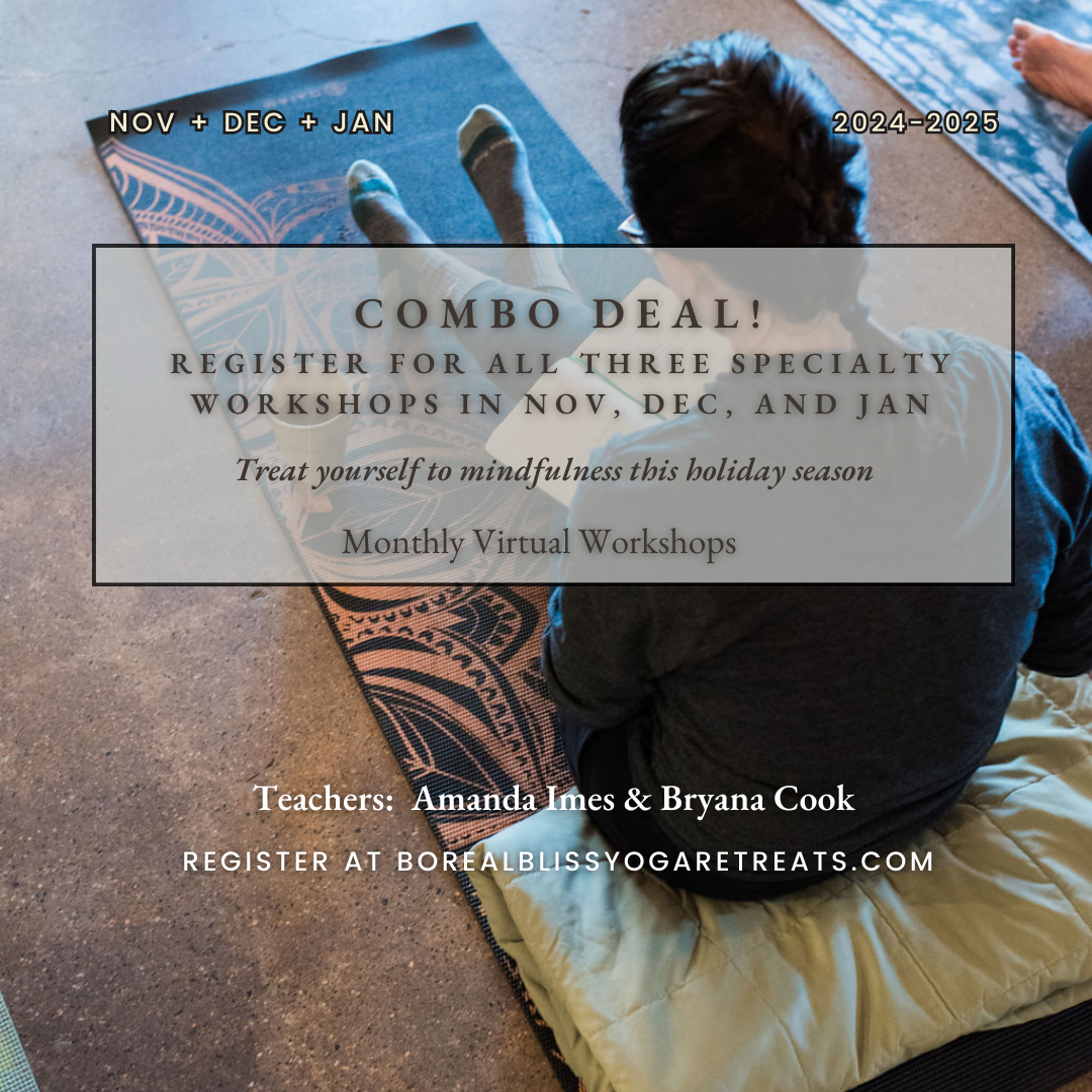 Yearly Subscription Discount: annual subscription discount from November - January. *Receive 20%-off discount on upcoming Nov-Jan live virtual workshops! Register before January 1 to be included in 21-Days of Boreal Bliss Virtual Yoga Toolkit offer!