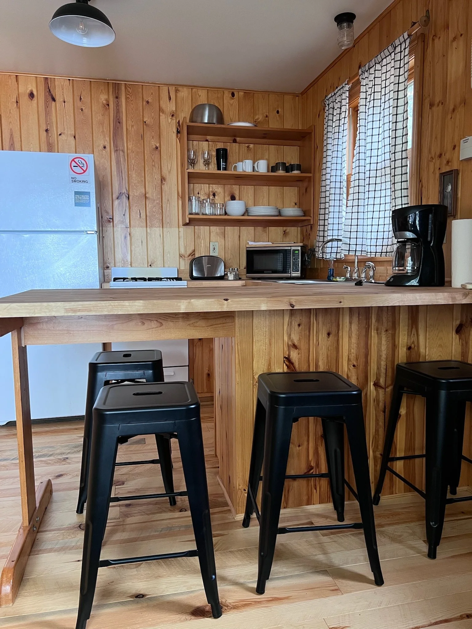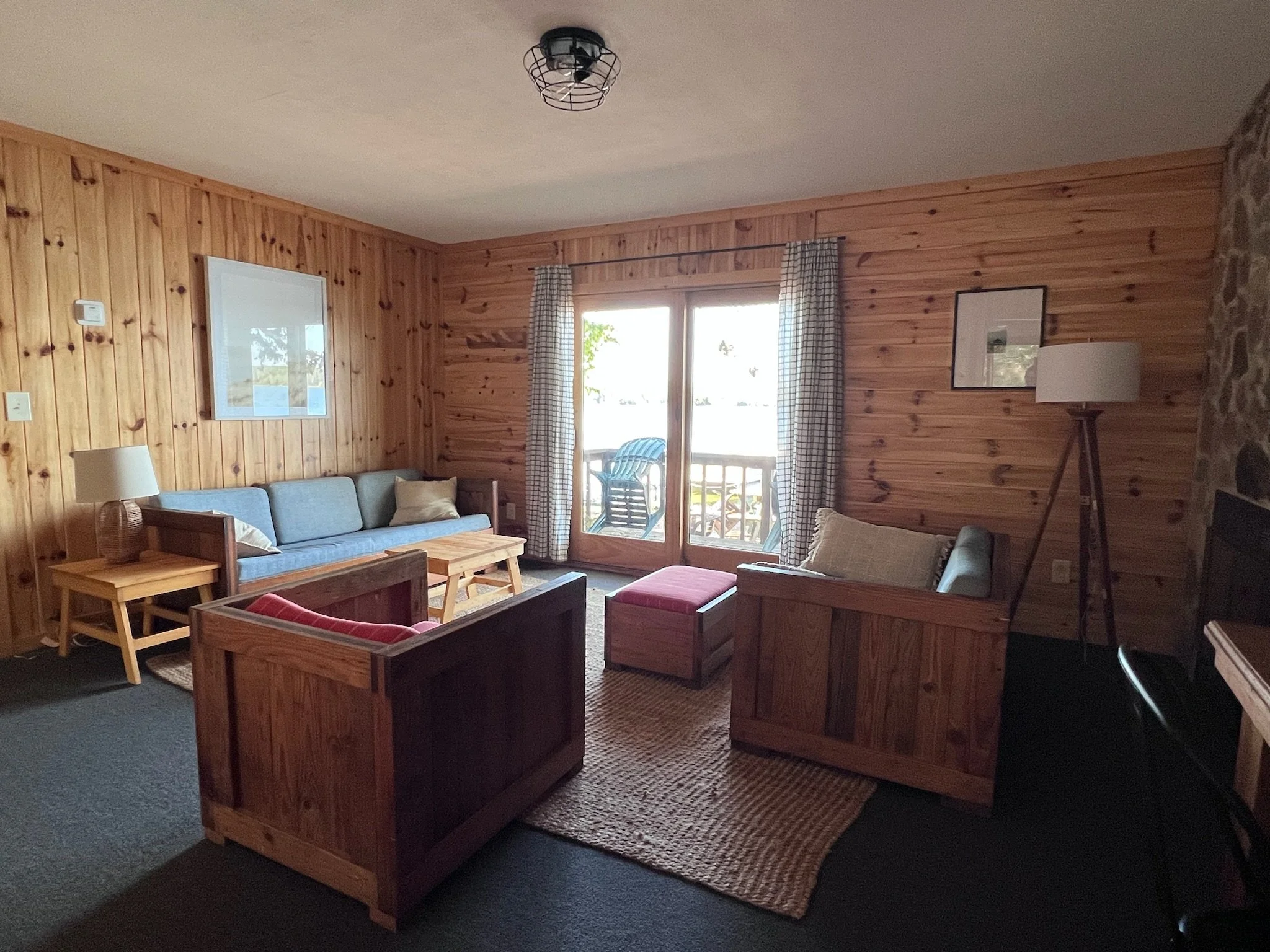 Each cabin boasts lakeside views, a shared kitchen, living room, and bathroom.